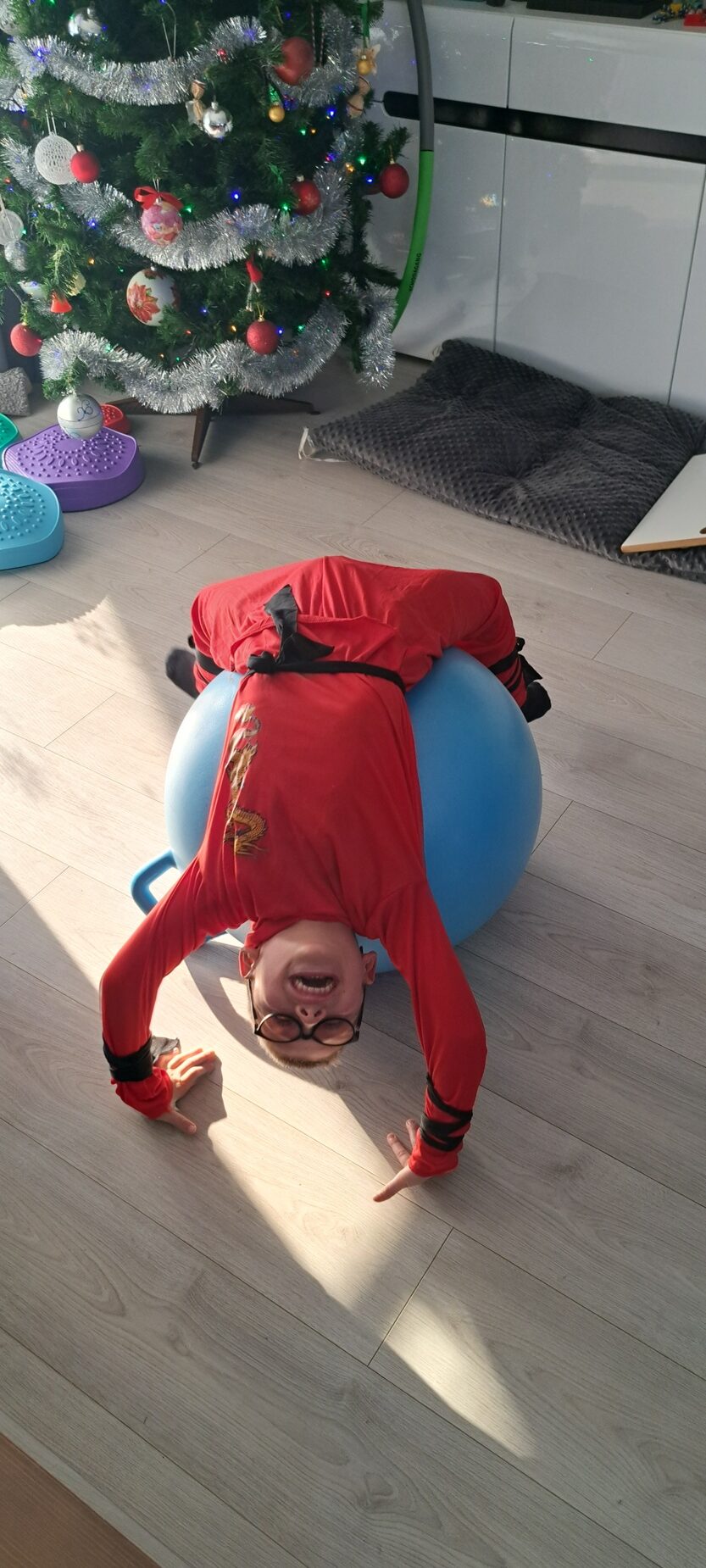 Synek urodził się w październiku 2019 roku, zdrowy, jak nam się wydawało. Dopiero brak pełzania w okolicach 6 miesiąca życia wzbudził nasze obawy. Z perspektywy czasu, pierwszymi objawami zwiastującymi nieprawidłowości były notoryczne wysuwanie języka i zez zbieżny jednego oka. Rozpoczęła się diagnostyka i równolegle rehabilitacja. W między czasie okazało się, że ma obniżone napięcie mięśniowe i bardzo słabo widzi (z wiekiem doszedł oczopląs, zez i wyrównawcze ruchy głową). Pojawiła się też duża nadwrażliwość na bodźce, ślinienie, zgrzytanie zębów i zaburzenia snu.